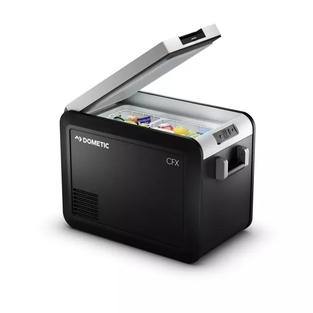 - Description: The CFX3 45 Powered Cooler is the same foot print as the CFX3 35, but is 2.75 inches taller creating a 46L space. It's single zone electric cooler can be used as a car fridge or freezer, reaching temperatures as low as -7°F, while using less power than a 60W light bulb. The high-performing compressor cooler was built for backroads, mounted on springs to isolate noise and reduce vibration. Powered by AC (110-240), DC (12 / 24 volt), or solar power, it connects to a phone app, allowing easy temperature monitoring and control.